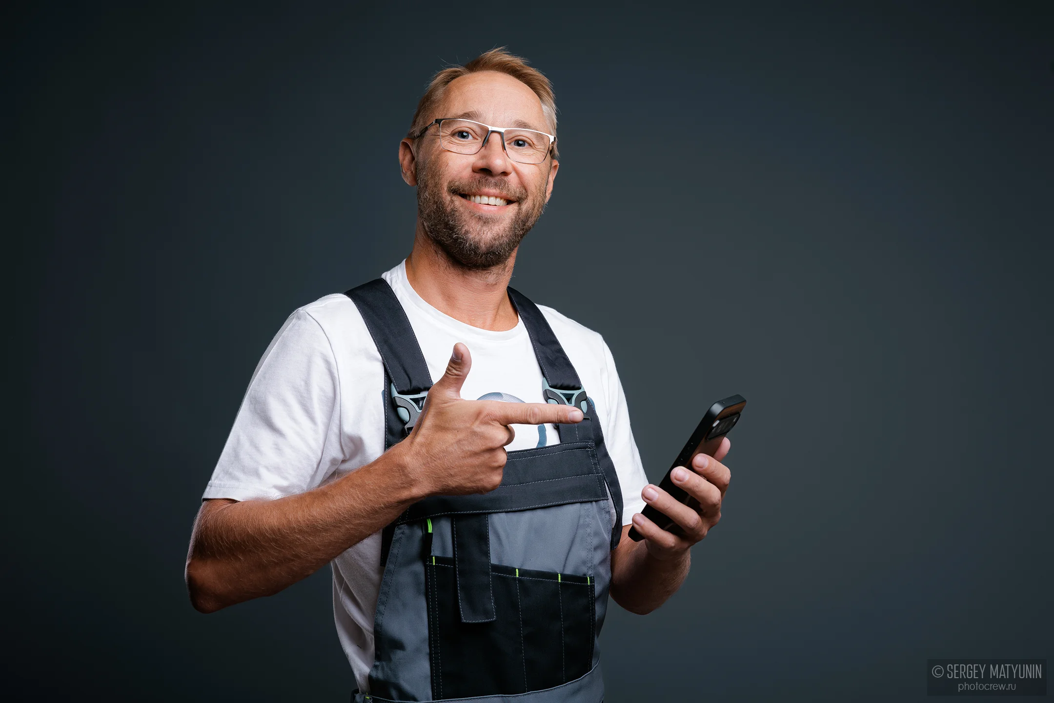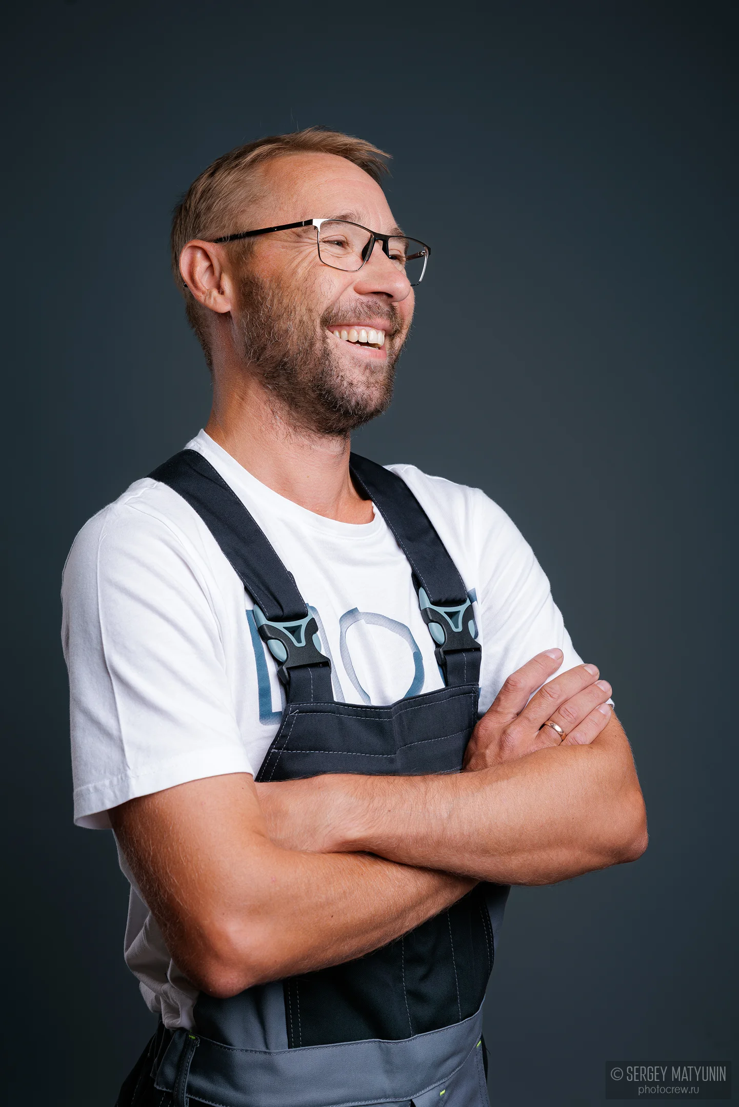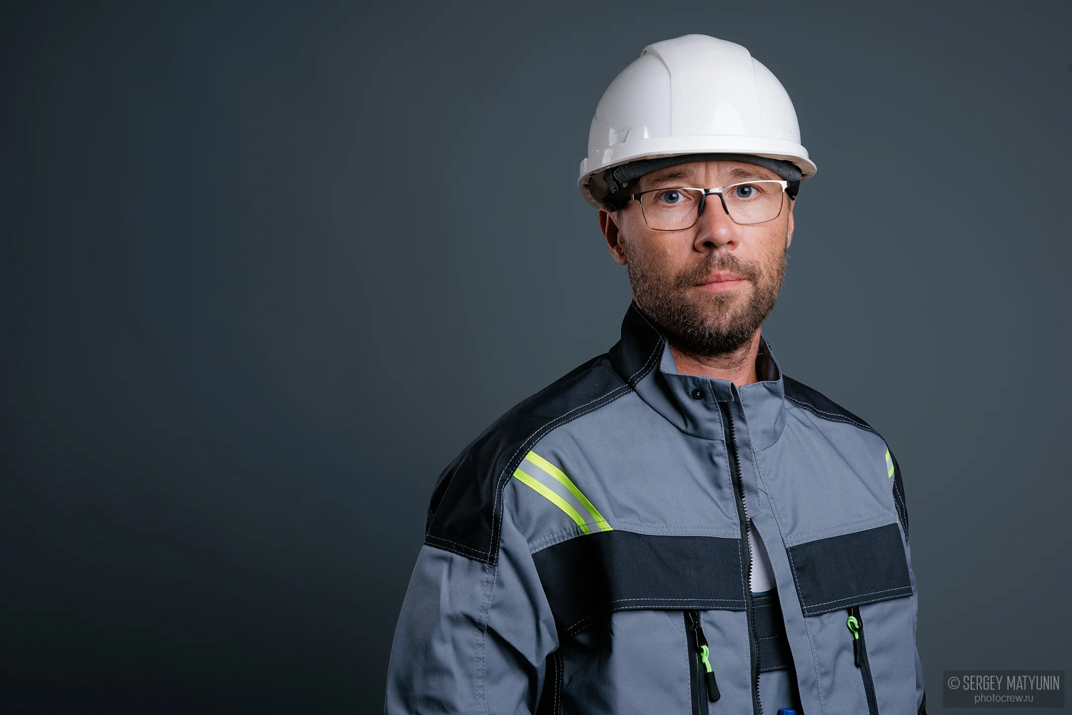 Первый этап — студийные портреты в рабочей одежде. Чистый фон, акцентный свет и спокойная подача помогают создать универсальные бизнес-портреты для сайта услуг, лендинга, экспертных публикаций и карточек специалистов. Это тот самый формат, который часто ищут по запросам «деловая фотосессия для сайта», «портрет специалиста для бизнеса», «фотосессия эксперта в спецодежде».